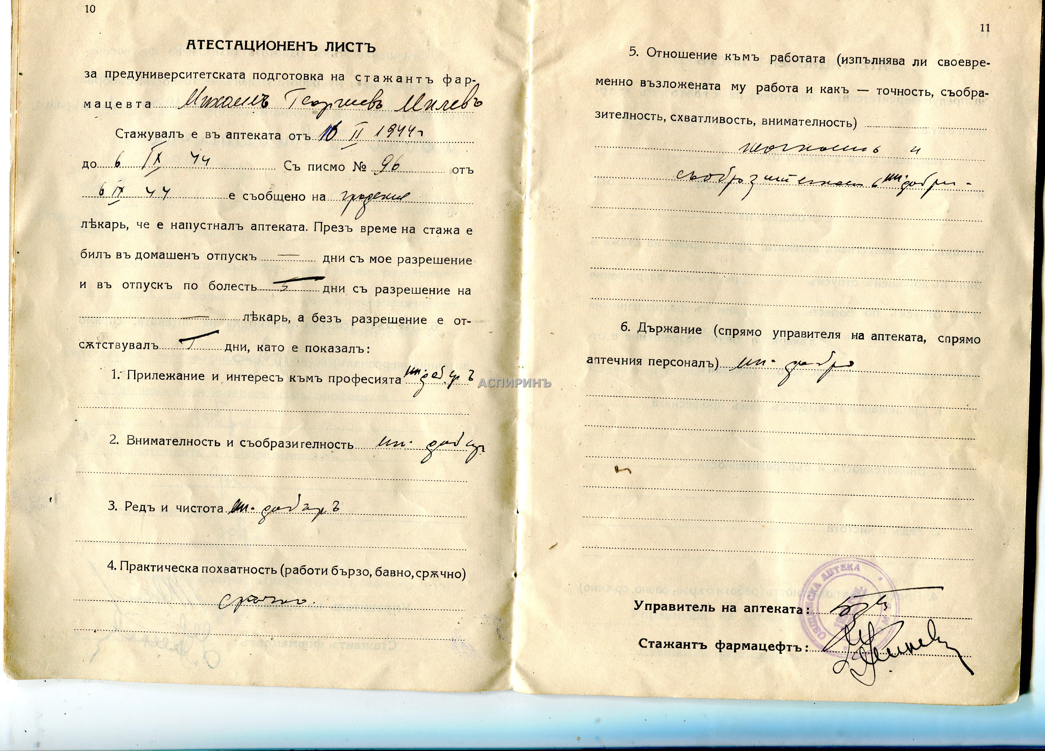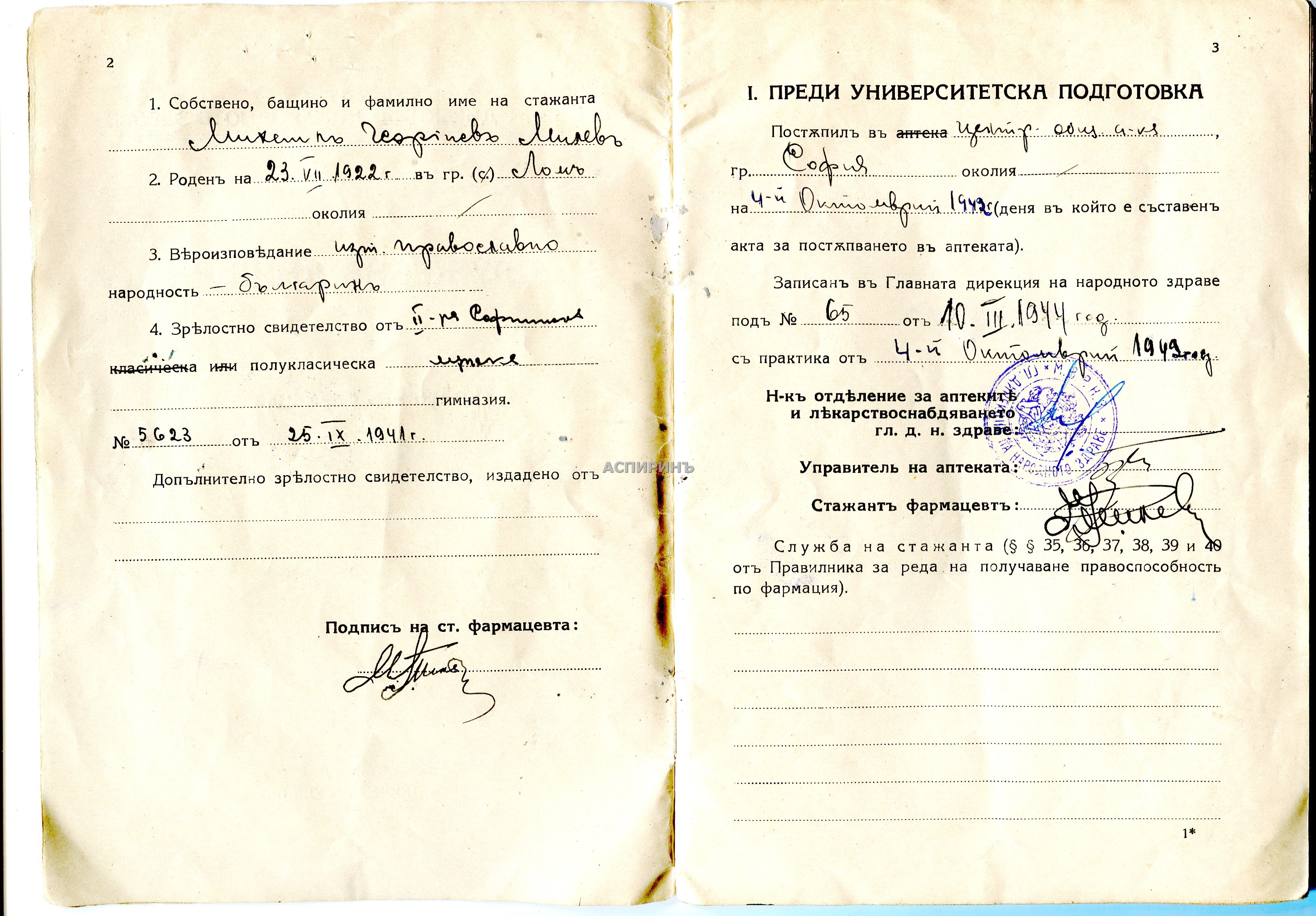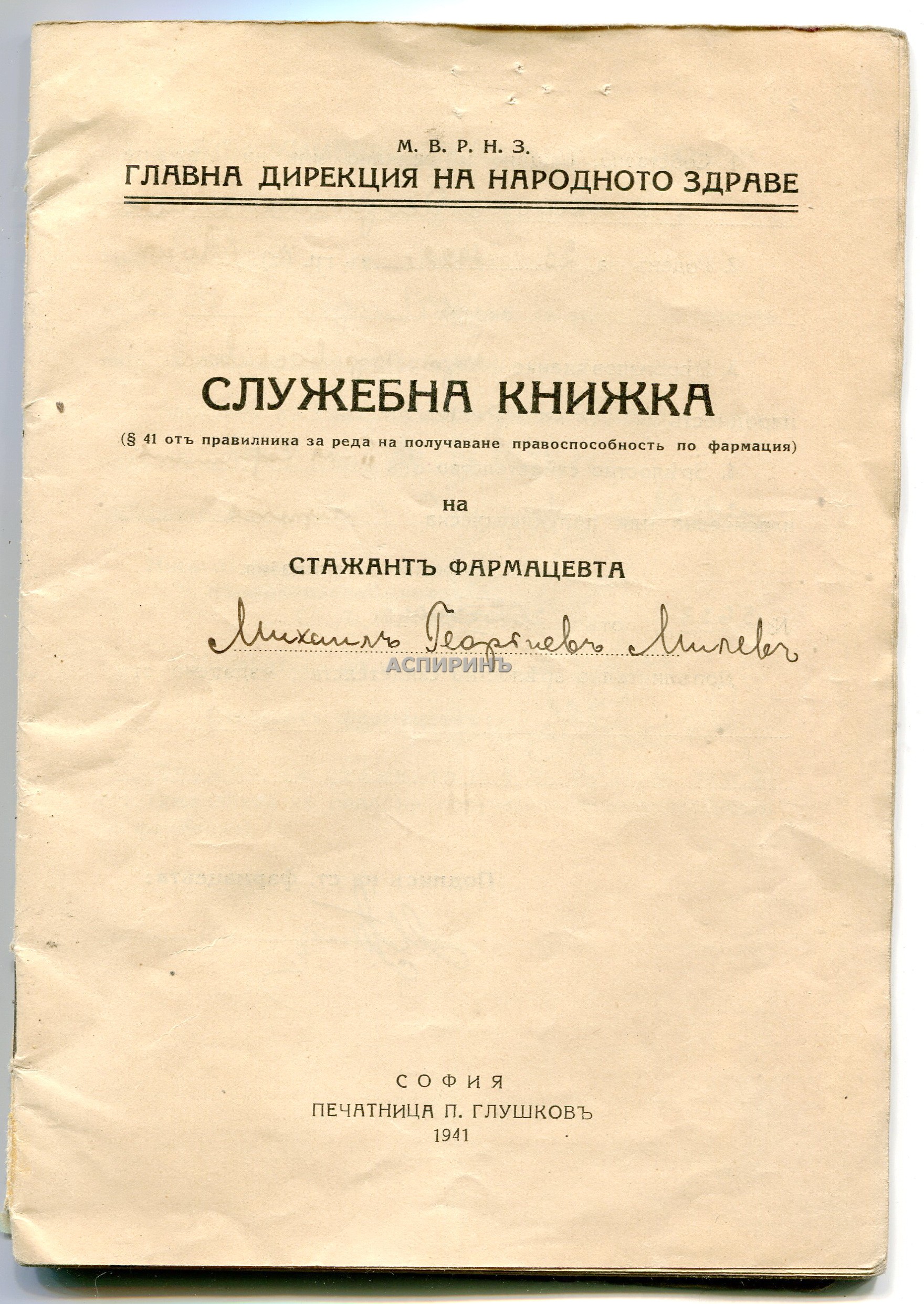 ПРОФЕСОР АСПАРУХ БОЙЧИНОВ (1900-67) Роден в Плевен. След завършване на гимназията става аптекарски ученик в Общинската аптека в града. ВМС го утвърждава като помощник-аптекар. Завършва фармация в университета в Магдебург. Бил е директор на Аналитичната лаборатория, а от 1942 г.става директор на фармако-химическата фабрика "Галенус". Бил е председател на Българския фармацевтечен съюз от 1939 до 1942 г. Постоянен член на Редколегията на сп. "Фармацевт". През 1951 г. е избран за доцент във ФФ на ВМА, от 1953 г. за Зам.декан, а от 1958 г. за професор и ръководител на Катедрата по фармакогнозия до пенсионирането му през 1965 г. Прикачени файлове: