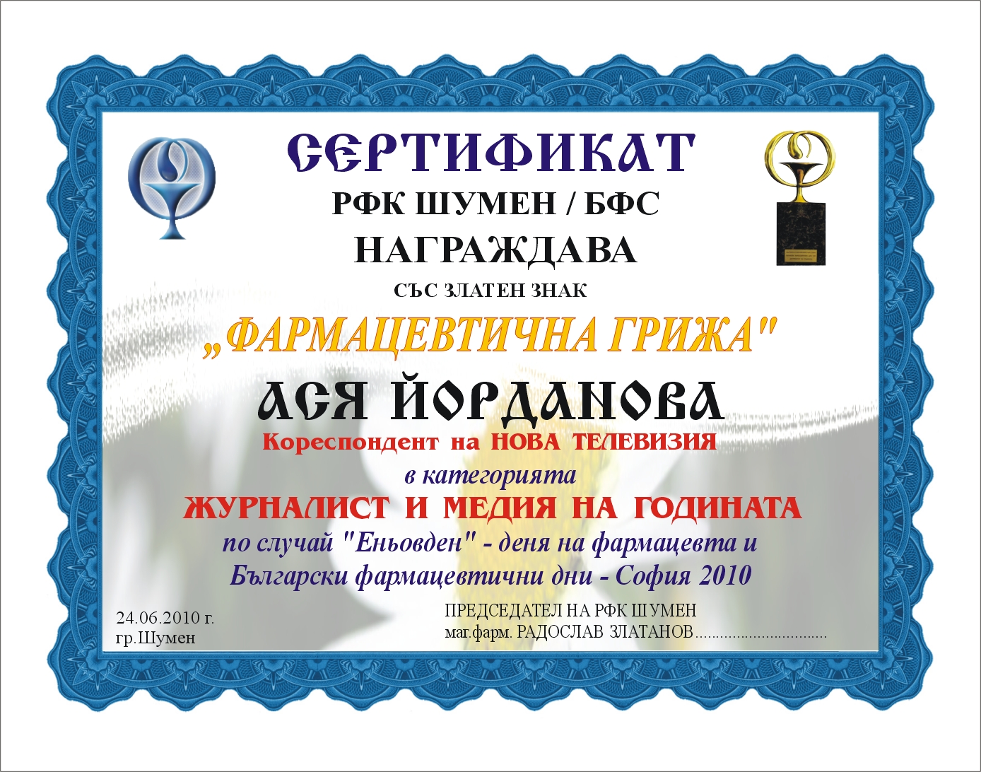 На официална церемония, Български фармацевтичен съюз връчи годишните си награди в рамките на Български фармацевтични дни 2010. За постигнати успехи в иновациите, социална значимост, достъпност, фармакологията, фитотерапията, технологията, маркетинга, комисия, съставена от специалисти определи следните награди за 2010г.: