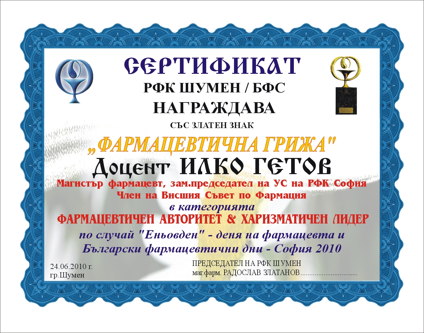 На официална церемония, Български фармацевтичен съюз връчи годишните си награди в рамките на Български фармацевтични дни 2010. За постигнати успехи в иновациите, социална значимост, достъпност, фармакологията, фитотерапията, технологията, маркетинга, комисия, съставена от специалисти определи следните награди за 2010г.: